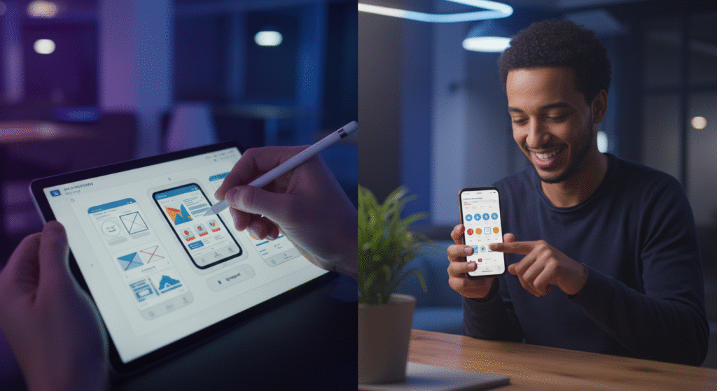 ببساطة: المصمم يخطط ويرسم، والمطور يبني وينفذ. مصمم UI/UX هو “المهندس المعماري” الذي يضع مخططات المنزل (التطبيق) ويتأكد من أنه جميل وسهل السكن. أما مطور الـ Front-End فهو “المقاول” الذي يأخذ هذه المخططات ويحولها إلى مبنى حقيقي باستخدام الكود (HTML, CSS, JavaScript). هذه الدبلومة تركز على الجزء الأول: التخطيط والتصميم.